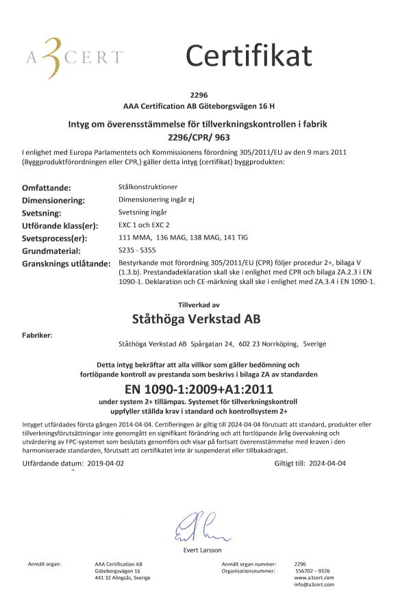 Ståthöga Verkstad AB grundades 1981, vi är ca 40 anställda och har en verkstadsyta på 1800 m2 . Yrkeskunnig och erfaren personal är våra starkaste resurser tillsammans med vår höga servicegrad. Vi är certifierad enlig ISO 9001(kvalitet), ISO 14001 (miljö), SS-EN 1090-EXC 1 och EXC 2 (bärande stålkonstruktioner). ISO 3834 (Svetsning vild tillverkning av stålkonstruktioner)